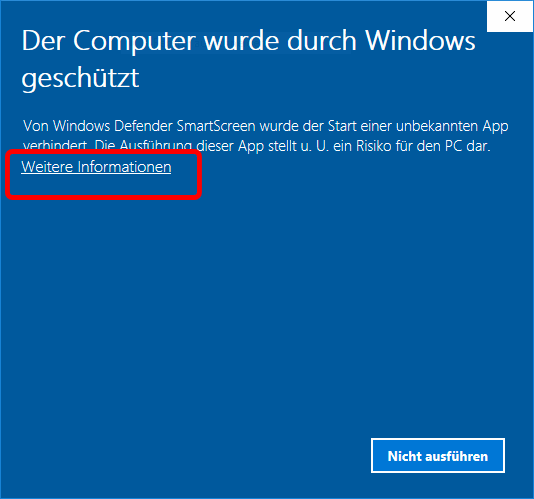 Die Installationsdatei setup.exe ist ca 16,1 MB groß. Wenn diese mittels EMail oder sonstwie aus dem Netz stammt, bremst Windows mit zwei Warnhinweisen. Zuerst müssen Sie Weitere Informationen anklicken (s.l.), dann auf Trotzdem ausführen klicken (s.r.). Dann erst startet die Installa­tion.