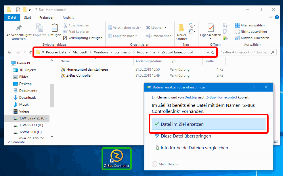 Im Bild sehen Sie unter dem geöffneten Startmenü-Ordner den Desktoplink des Z-Bus-Controllers (grün markiert; s.r.), den Sie unter a) berichtigt hatten. Nach Rechtsklick auf diesen Link wählen Sie im Kontextmenü den Befehl Kopieren und dann nach Rechtsklick im Startmenü-Ordnerfenster den Befehl Einfügen. Daraufhin klicken Sie im neuen Fenster auf Datei im Ziel ersetzen.