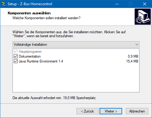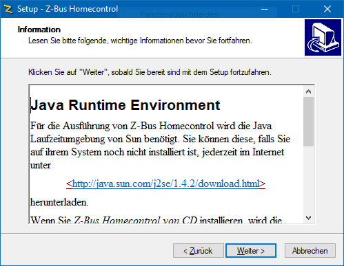 Ohne diese Version von Java läuft der Z-Bus-Controller nicht. Sie dürfen also später die JRE nicht aktualisieren!