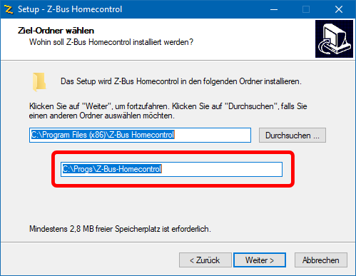 Dann müssen Sie einen Zielordner wählen (s.r.). Folgen Sie nicht dem Vorschlag, sondern wählen Sie z.B. C:\Progs\Z-Bus-Homecontrol, wie rechts rot markiert ins Bild montiert ist. .