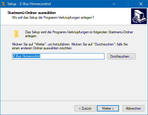 Installieren Sie die Z-Bus-Homecontrol in einen selbstgewählten Ordner, der keinen Windows-Restriktionen unterliegt, z.B. in C:\Progs\. Die Installation läuft dann folgendermaßen ab (alle Bilder wurden unter Windows 10 erstellt):