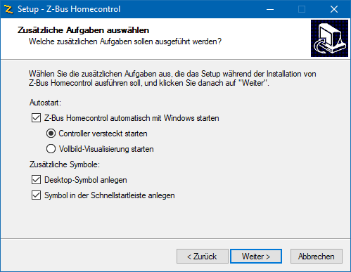 Da der Z-Bus-Controller non stop laufen sollte, sollte der Z-Bus-PC nie heruntergefahren werden, außer zu Wartungsarbeiten. Da ist es gute Praxis, die Z-Bus Homecontrol im Autostartordner zu verankern, damit sie beim Neustart auomatisch mit gestartet wird. Daher kann diese Autostartfunktionalität beim Installieren aktiviert werden (Punkt 6). Aber leider klappt das unter Windows 10 so nicht.