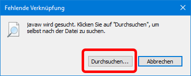 Beim Programmaufruf wurde offensichtlich die Java-Standardbibliothek javaw.exe nicht gefunden, weil sich die Aufrufverwaltung seit Windows XP geändert hat. Dadurch sind die Links in den zuvor aufgeführten Punkten 3 - 6 mit nun falschen Parametern ausgestattet und funktionieren daher nicht unter dem aktuellen Windows.